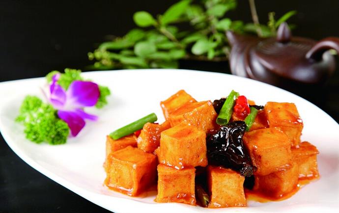 4.下入之前煎好的豆腐,放入八角桂皮老抽生抽冰糖花椒葱结干辣椒盐,再下入淹过锅内所有材料