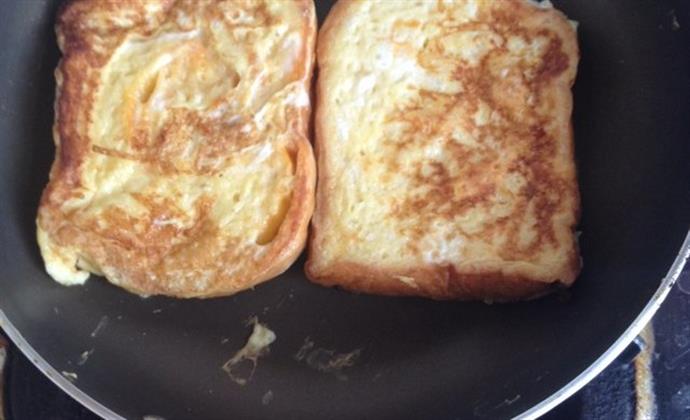 做法 1.鸡蛋打散,加入奶油,牛奶,少许糖和肉桂粉.将面包片浸泡在蛋奶糊中.3.锅中涂一层黄油,放入面包片.每一面煎3分钟左右至金黄即可出锅.切成三角型. 酸奶中加入少许奶油,充分搅打.撒上葡萄干.最后在面包片上和酸奶酱中淋蜂蜜即可.