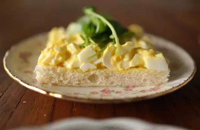 6 取一片面包,将半份混合好的鸡蛋沙拉均匀涂在上面,