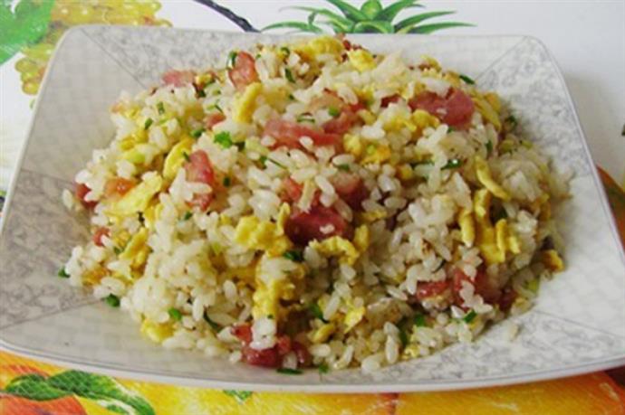 4把蛋花装起来,不用加油了,倒入切好的香肠小火煸炒1分钟这样,然后倒入米饭.