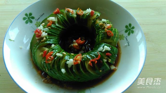 2.黄瓜蓑衣刀切先在一边平切,不要切断,怕切断的可以在旁边放一根筷子,阻止刀往下切.然后把黄瓜翻180度,在另一边,刀与黄瓜呈45度角斜切,也是不能切断.切好后,盘放在碟子上备用;
