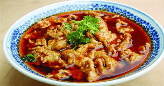 ④坐锅,放少量油,油烧热后放入豆瓣辣酱,炒出红油后放入葱姜蒜翻炒几下,放少量水,开锅放入少许盐鸡精,放入青菜,断生后捞出装入碗内,将浆好的肉一片一片滑入锅内,待肉变色熟透后连汤一起装入碗内;