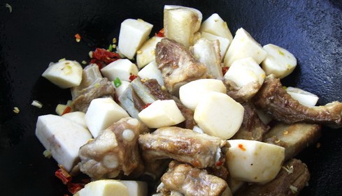 4倒入排骨汤炖开改小火,直至汤快干时加入鸡精即可装盘,撒上蒜苗;